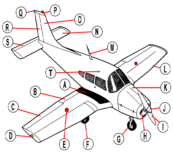 D Wing-tip light: Navigation lights so other pilots can work out which way you are heading at night. Green on the right (starboard) wing and red on the left (Port) wing.